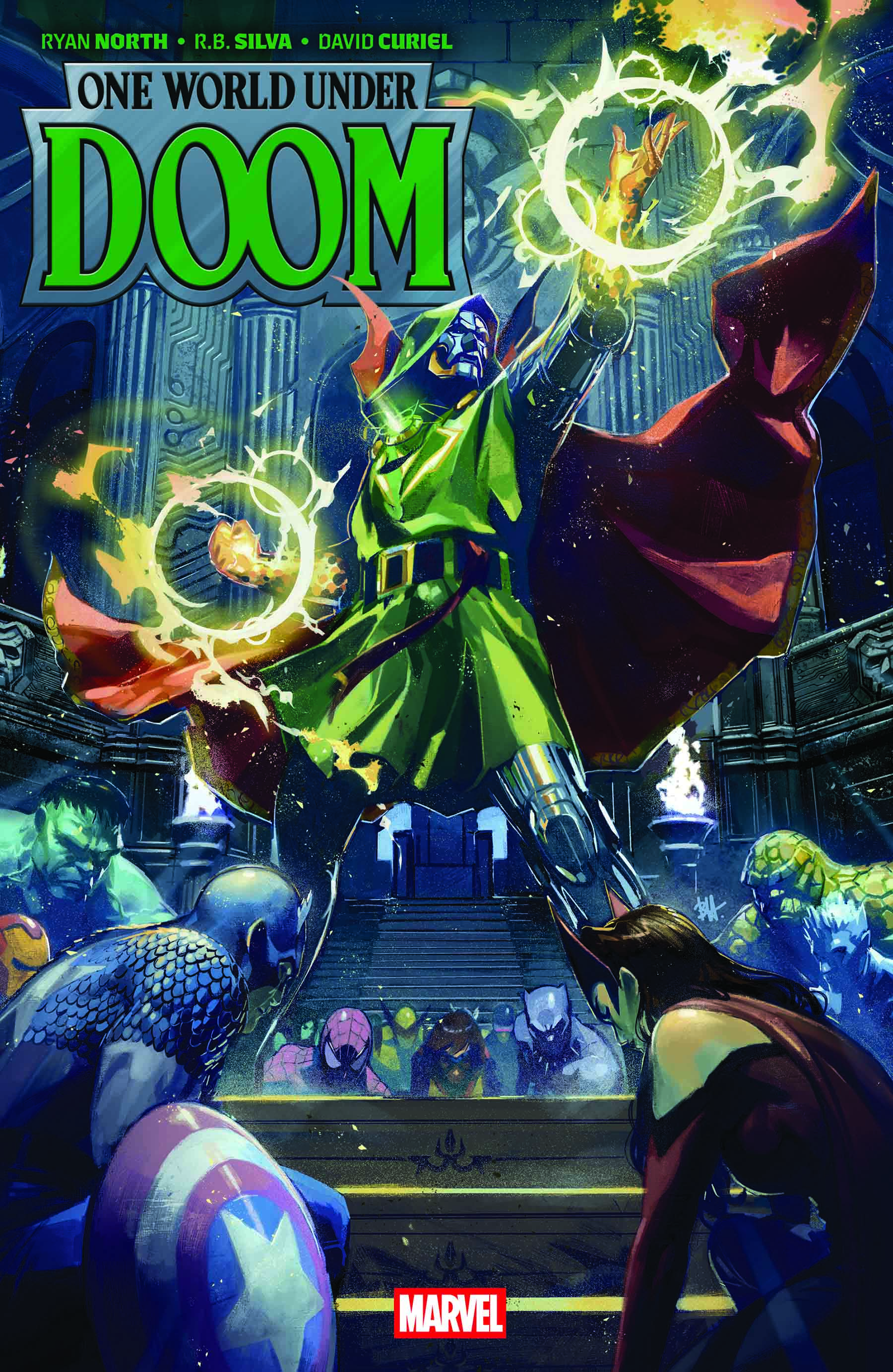 Doctor Doom he declares himself Emperor of the World! Six months ago, Victor Von Doom saved the world from vampires by assuming the mantle of Sorcerer Supreme - then disappeared behind Latveria's closed borders. But his absence was merely the calm before the storm - a storm that has now arrived. The world wakes up to a new reality: Doom has magically taken over every broadcast medium on Earth and declared himself the ruler of the planet under the flag of a new United Latveria! And shockingly, impossibly, all global leaders seem to be going along with it. Luckily, whether it's mind control or Doombots, whatever's affecting them hasn't affected Earth's heroes - so they quickly form a strike team to stop Doom's machinations. But nothing will go as expected for the Fantastic Four, the Avengers and their allies! What happens when some begin to welcome their new Emperor with open arms, clamoring for ONE WORLD UNDER DOOM? Collecting ONE WORLD UNDER DOOM (2024) #1-9.