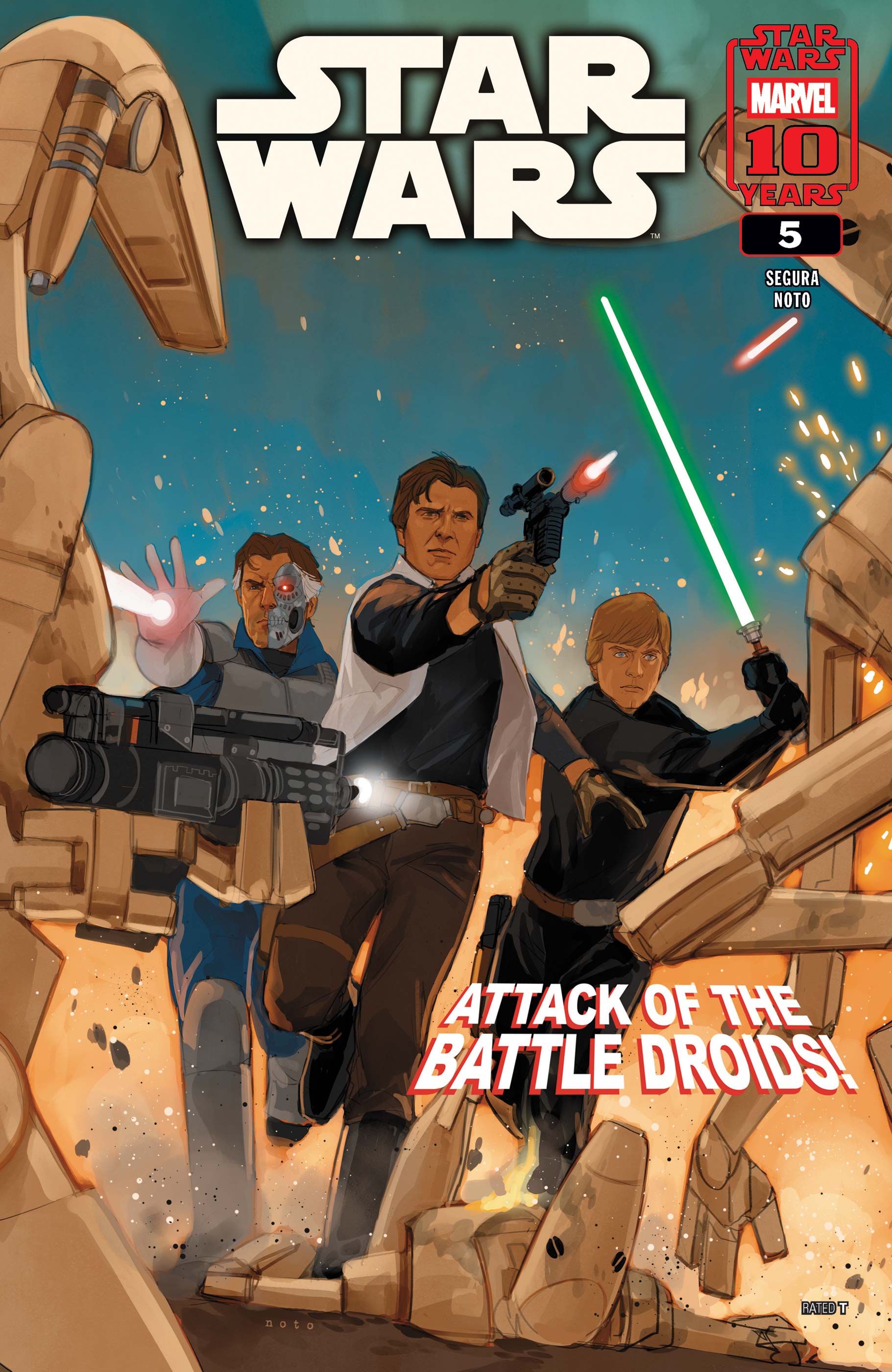 THE PAST RETURNS! As LUKE, RYNN, HAN and VALANCE race to find a group of stranded traders - they uncover a startling, and deadly, relic from the past - and have to face off against a horde of BATTLE DROIDS! LEIA and MON MOTHMA face an unexpected and powerful attack! Who is the new leader of the Nagai resistance? Cornered on a desolate planet, our heroes are left with one shocking option to survive!